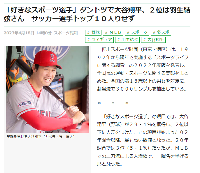 「好きなスポーツ選手」の項目では、大谷翔平(野球)が29・1%を獲得し、2位以下に大差をつけた。