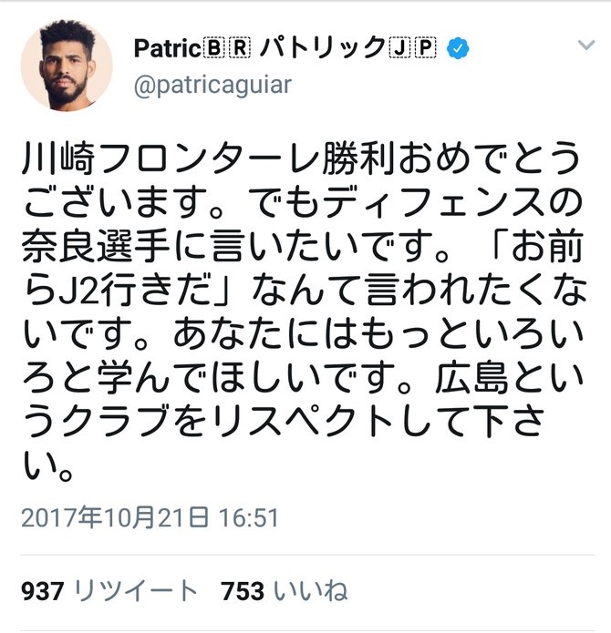 広島のパトリック選手は川崎戦の試合後、ツイッターで「川崎フロンターレ勝利おめでとうございます」と