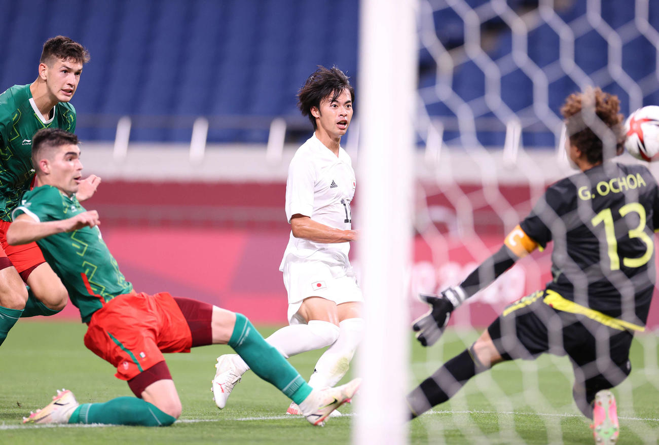 独特なリズムのドリブルでメキシコ守備陣に対して先手を奪うと、同23分には絶妙なスルーパスを上田に通して決定機を創出。そして同33分、MF久保建英からのパスをペナルティーエリア手前で受けた三笘は、